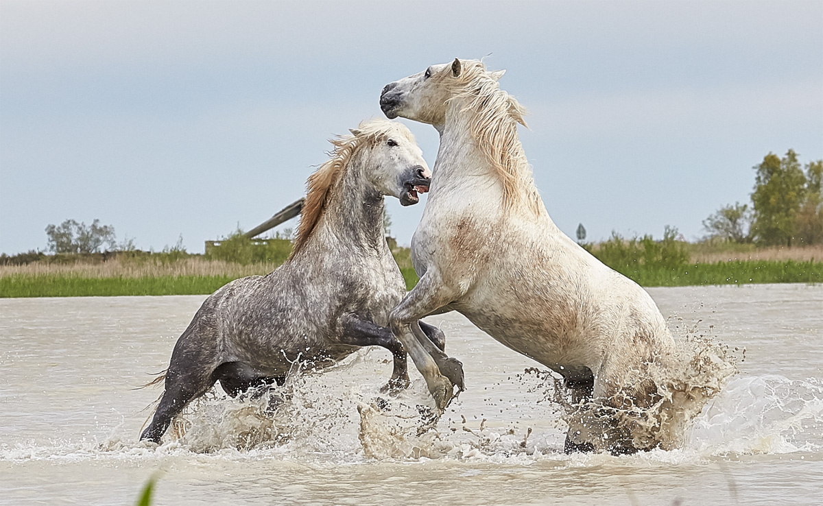 The Camargue horse is one of the oldest breeds in the world, adapted to the harsh environment of salt marshes, lagoons, and reed beds. Born dark brown or black, they gradually turn white by adulthood. Their hardiness allows them to thrive outdoors year-round, grazing on salty grasses that few other animals can digest.